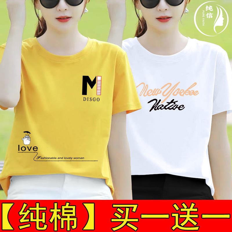 純信純綿半袖Tシャツ女性ゆったり韓国版夏服女性2021夏新着商品女性半袖太mm大サイズTシャツファッションカジュアル女性トップスD 1黄色711項+白801項L【おすすめ90-15斤】