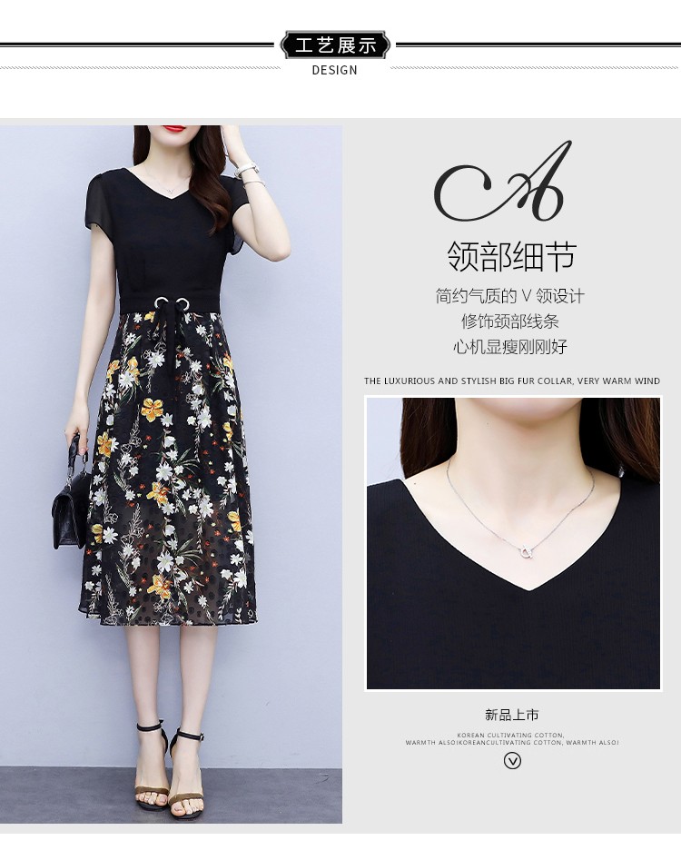 夏の服の女性の半袖ファッションのシフォン新商品が明らかに痩せて大きいサイズの婦人服プリントの偽の2つのセットセットセイントスカートの小柄な花のスカートの女性の夏の黒いL【提案95-110斤】