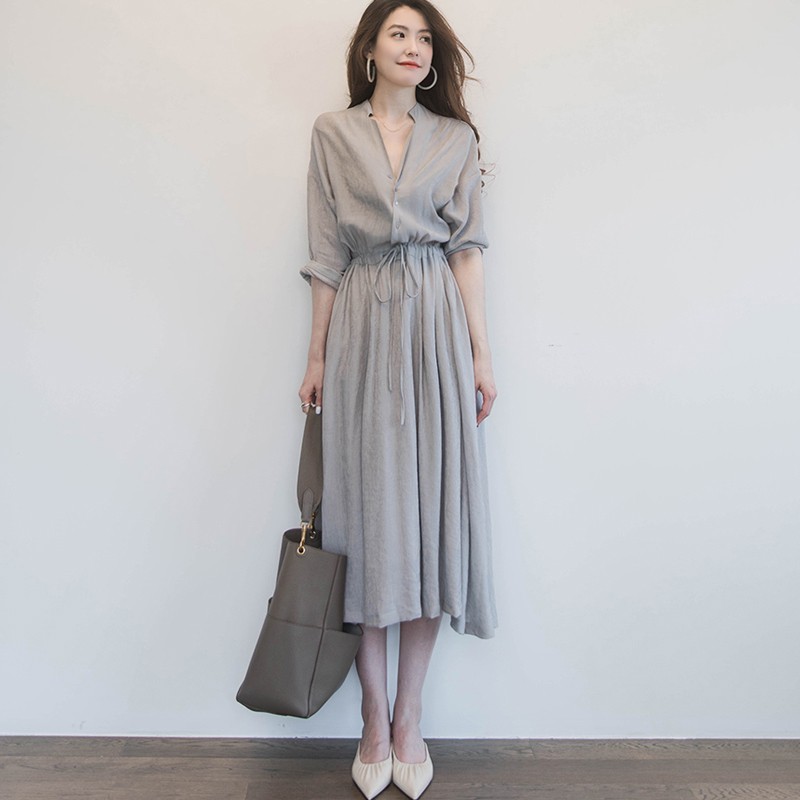 莱倪晟納長袖ワンピス婦人服新品2021春新商品韓国版のゆったりファッション減齢小柄なレイトロ調プリントシフォンの膝の中の長さが目立つスリムなスカート夏灰色XL【おすすめ135-45斤】