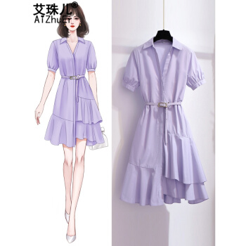 エパールの紫のシャツワンピスの女性夏2020新商品は腰の小さい背の気质のフランス式の小众の中に长いスカートの白色のMを収めます。